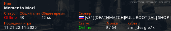 Играет на Counter Strike Source сервере. Страна: РоссияПервый раз замечен 13:53 25.08.2024