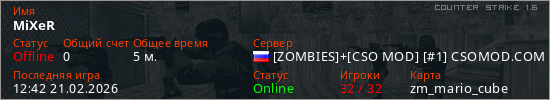 Играет на Counter Strike 1.6 сервере. Страна: РоссияПервый раз замечен 12:27 21.02.2026