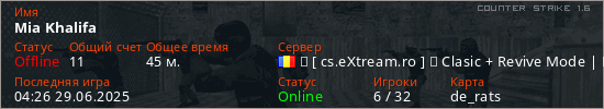 Играет на Counter Strike 1.6 сервере. Страна: РумынияПервый раз замечен 13:53 03.02.2025