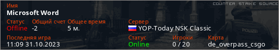 Играет на Counter Strike Source сервере. Страна: РоссияПервый раз замечен 11:07 31.10.2023
