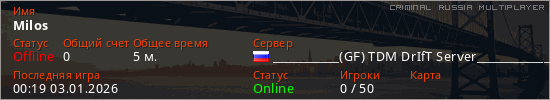Играет на Criminal Russia Multiplayer сервере. Страна: РоссияПервый раз замечен 00:17 03.01.2026