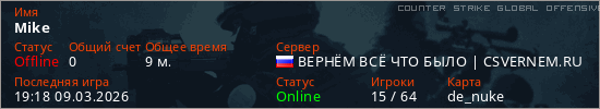 Играет на Counter Strike Global Offensive сервере. Страна: РоссияПервый раз замечен 14:19 06.03.2026