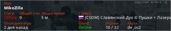 Играет на Counter Strike 1.6 сервере. Страна: РоссияПервый раз замечен 20:14 21.03.2026