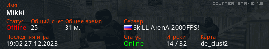 Играет на Counter Strike 1.6 сервере. Страна: РоссияПервый раз замечен 21:49 18.11.2022