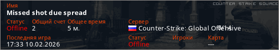 Играет на Counter Strike Source сервере. Страна: РоссияПервый раз замечен 17:16 10.02.2026