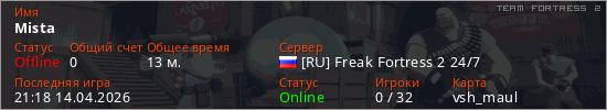 Играет на Team Fortress 2 сервере. Страна: РоссияПервый раз замечен 18:09 14.04.2026