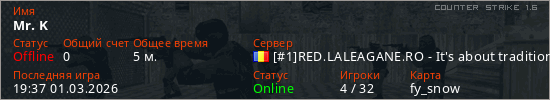 Играет на Counter Strike 1.6 сервере. Страна: РумынияПервый раз замечен 19:33 01.03.2026