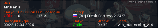 Играет на Team Fortress 2 сервере. Страна: РоссияПервый раз замечен 02:12 02.04.2026