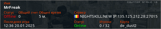 Играет на Counter Strike 1.6 сервере. Страна: РумынияПервый раз замечен 12:32 20.01.2025