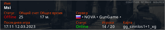 Играет на Counter Strike Source сервере. Страна: РоссияПервый раз замечен 16:56 12.03.2023
