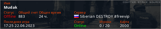 Играет на Counter Strike Source сервере. Страна: РоссияПервый раз замечен 15:26 21.02.2023