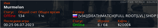 Играет на Counter Strike Source сервере. Страна: РоссияПервый раз замечен 15:18 09.06.2023