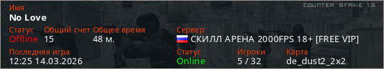 Играет на Counter Strike 1.6 сервере. Страна: РоссияПервый раз замечен 12:15 14.03.2026