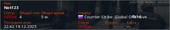Играет на Counter Strike Source сервере. Страна: РоссияПервый раз замечен 22:40 19.12.2025