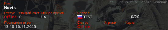 Играет на Call of Duty 4: Modern Warfare сервере. Страна: РоссияПервый раз замечен 11:41 16.11.2025