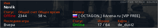 Играет на Counter Strike Source сервере. Страна: РоссияПервый раз замечен 05:01 30.09.2021
