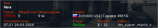 Играет на Counter Strike Source сервере. Страна: РоссияПервый раз замечен 11:01 21.03.2026