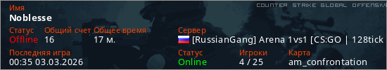 Играет на Counter Strike Global Offensive сервере. Страна: РоссияПервый раз замечен 17:27 02.03.2026