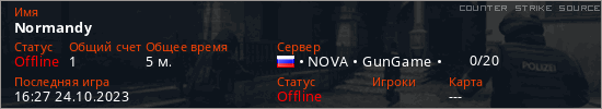 Играет на Counter Strike Source сервере. Страна: РоссияПервый раз замечен 16:23 24.10.2023