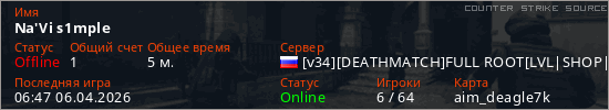 Играет на Counter Strike Source сервере. Страна: РоссияПервый раз замечен 06:41 06.04.2026