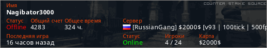 Играет на Counter Strike Source сервере. Страна: РоссияПервый раз замечен 01:42 28.03.2023