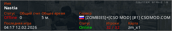 Играет на Counter Strike 1.6 сервере. Страна: РоссияПервый раз замечен 04:15 12.02.2026