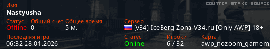 Играет на Counter Strike Source сервере. Страна: РоссияПервый раз замечен 06:28 28.01.2026