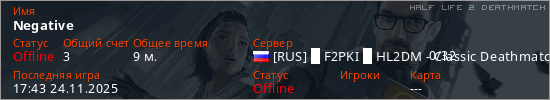 Играет на Half Life 2 DeathMatch сервере. Страна: РоссияПервый раз замечен 18:17 17.11.2025