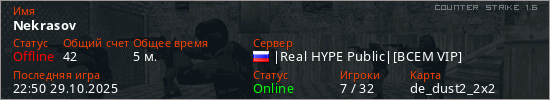 Играет на Counter Strike 1.6 сервере. Страна: РоссияПервый раз замечен 22:48 29.10.2025