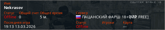 Играет на Counter Strike 1.6 сервере. Страна: РоссияПервый раз замечен 19:07 13.03.2026