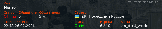 Играет на Counter Strike 1.6 сервере. Страна: УкраинаПервый раз замечен 22:24 06.02.2026