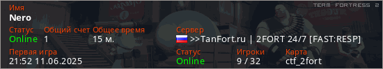 Играет на Team Fortress 2 сервере. Страна: РоссияПервый раз замечен 21:52 11.06.2025