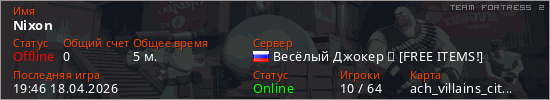 Играет на Team Fortress 2 сервере. Страна: РоссияПервый раз замечен 19:40 18.04.2026