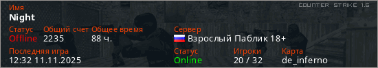 Последний раз был в сети 12:32 11.11.2025 Игрок с таким ником замечен на 31 сервере