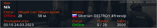 Играет на Counter Strike Source сервере. Страна: РоссияПервый раз замечен 12:46 26.02.2023