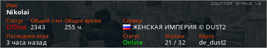 Играет на Counter Strike 1.6 сервере. Страна: РоссияПервый раз замечен 01:39 11.12.2024