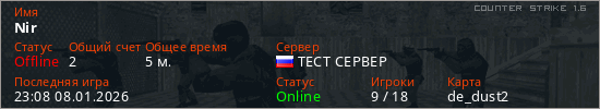 Играет на Counter Strike 1.6 сервере. Страна: РоссияПервый раз замечен 23:04 08.01.2026