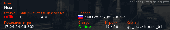 Играет на Counter Strike Source сервере. Страна: РоссияПервый раз замечен 17:02 24.06.2024
