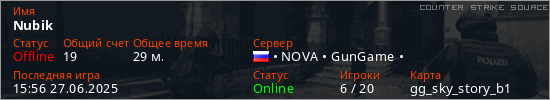 Играет на Counter Strike Source сервере. Страна: РоссияПервый раз замечен 18:18 08.08.2023
