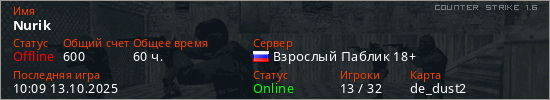 Играет на Counter Strike 1.6 сервере. Страна: РоссияПервый раз замечен 14:21 13.04.2024