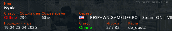 Играет на Counter Strike 1.6 сервере. Страна: СШАПервый раз замечен 13:49 17.04.2025