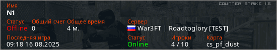 Играет на Counter Strike 1.6 сервере. Страна: РоссияПервый раз замечен 09:16 16.08.2025