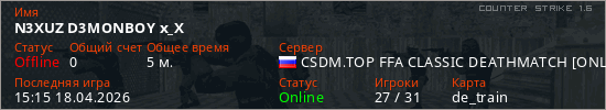 Играет на Counter Strike 1.6 сервере. Страна: РоссияПервый раз замечен 15:11 18.04.2026