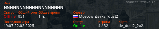 Играет на Counter Strike 1.6 сервере. Страна: РоссияПервый раз замечен 17:39 07.02.2025