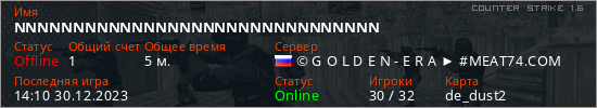 Играет на Counter Strike 1.6 сервере. Страна: РоссияПервый раз замечен 13:54 30.12.2023