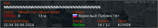 Последний раз был в сети 22:34 30.06.2024 Игрок с таким ником замечен на 13 серверах