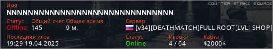Играет на Counter Strike Source сервере. Страна: РоссияПервый раз замечен 18:47 19.04.2025