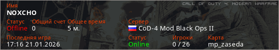 Играет на Call of Duty 4: Modern Warfare сервере. Страна: РоссияПервый раз замечен 17:14 21.01.2026