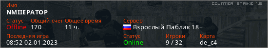 Играет на Counter Strike 1.6 сервере. Страна: РоссияПервый раз замечен 13:01 10.11.2019