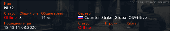 Играет на Counter Strike Source сервере. Страна: РоссияПервый раз замечен 20:46 10.03.2026